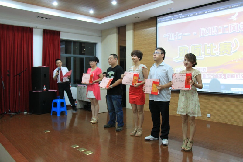 比賽結束后,鳳鳴街道領導郁歡、吳霞萍、勞偉根等向獲得一、二、三等獎的選手頒發證書和獎金,我公司蔣亞群的《軍港之夜》、趙健的《中國人》、平曉紅的《愛的奉獻》獲三等獎,周志生的《我的老班長》獲優秀獎。